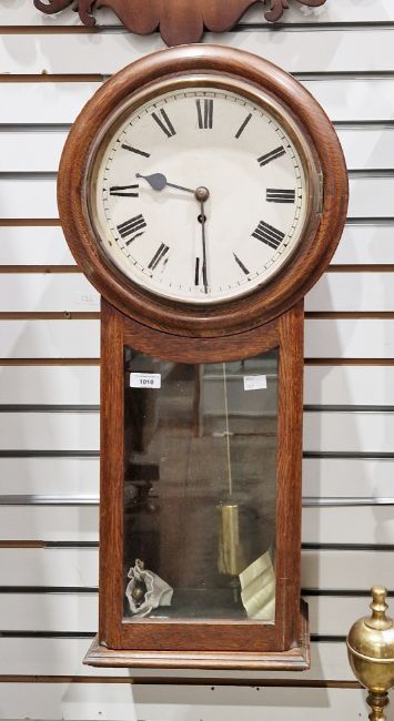 Late 19th/early 20th century oak-cased drop dial wall clock having Roman numerals, glazed case below, eight-day fusee movement, with heavy cylindrical brass pendulum, 74cm high