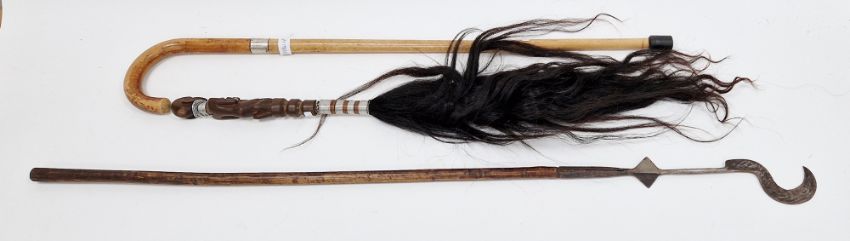 Edwardian silver collared walking canean African carved wooden horse hair fly whisk and a turned wooden hook mounted agricultural implement, possibly a hop growers hook (3)
