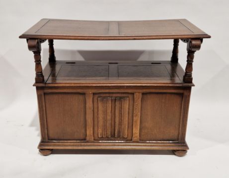Reproduction carved oak monk's bench with linenfold panelling to the hinged table-top/seat back, having scroll arms and on box base, 107cm high (opened) x 95cm wide x 50cm deep