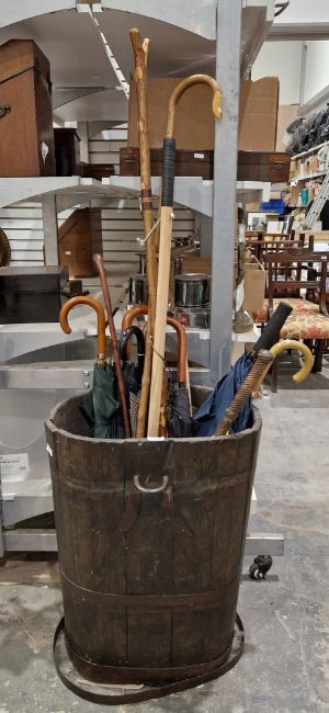 Collection of umbrellas, walking canes, a riding crop, alpine walking sticks, a Bisley folding seat, all within a 19th century coopered oak barrel of tapering oval form with iron lug handles, barrel 65cm high