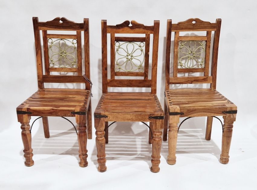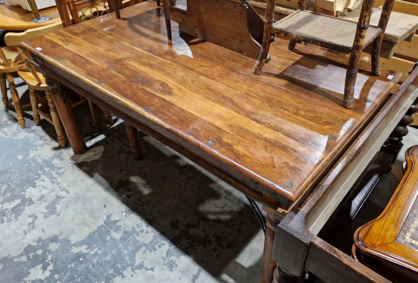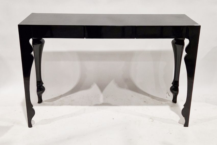 Modern stained hardwood dining table of rectangular form, 78cm high x 164cm long x 92cm deep and three matching dining chairs and a modern black lacquered hall table of rectangular form, with three short drawers to the front, 81cm high x 125cm wide x 42cm deep