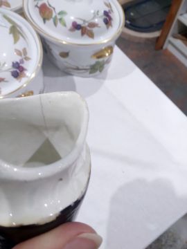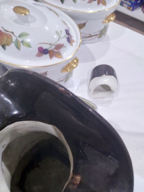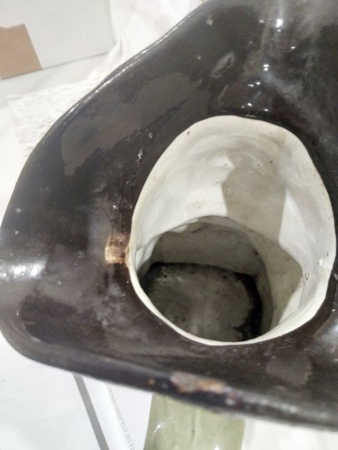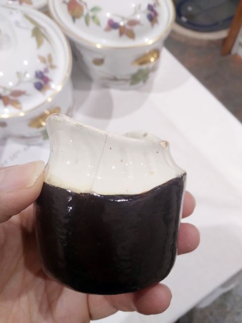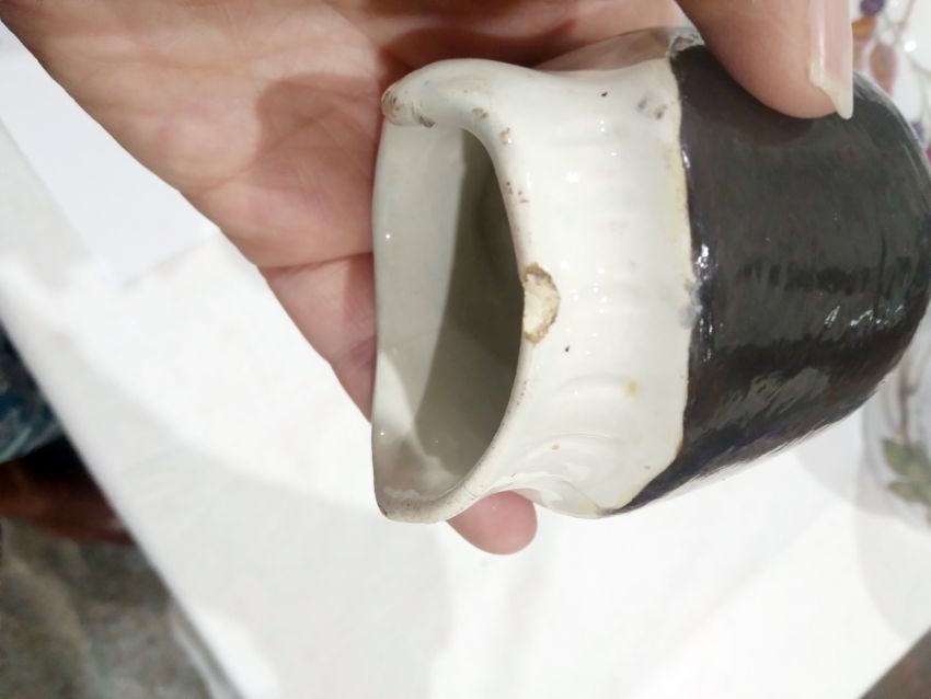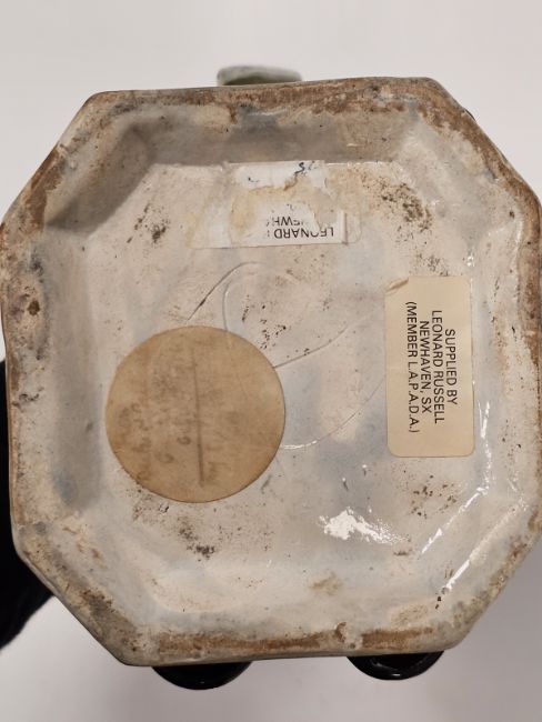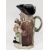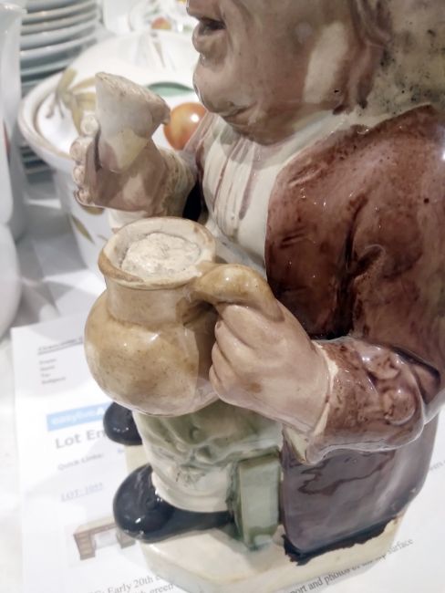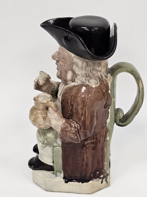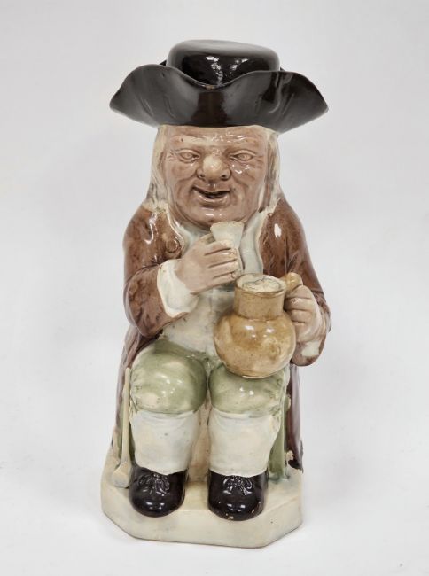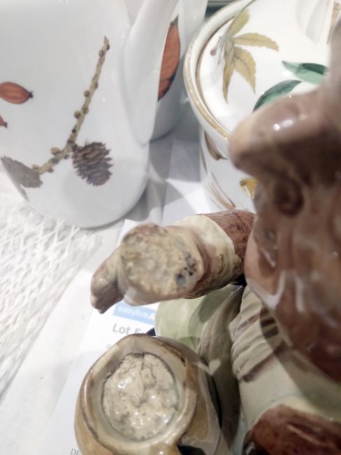 The cover with a small rim chip, two hairline cracks and later overpainting to the brown enamel (although it does not appear to have been broken into pieces so is more likely to be retouching to the brown enamel which has flaked), the brown rim of the toby jug with approx. one third of the rim with some restored overpainting, also with a small rim chip and minor flakes, minor firing crack to handle (handle in good order), his pipe at base is a later replacement, minute chipping to tip of one shoe, some typical wear but overall of good decorative appearance. There is an indistinct incised mark to base (E?)