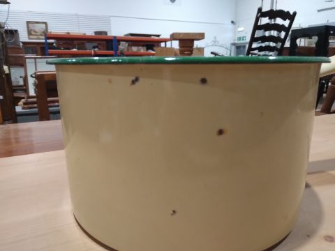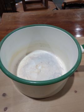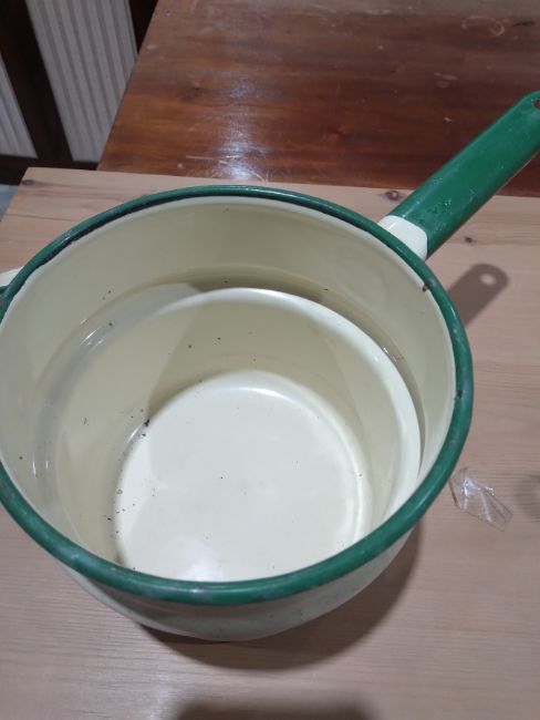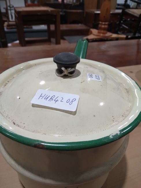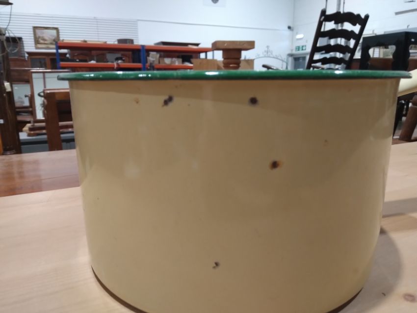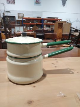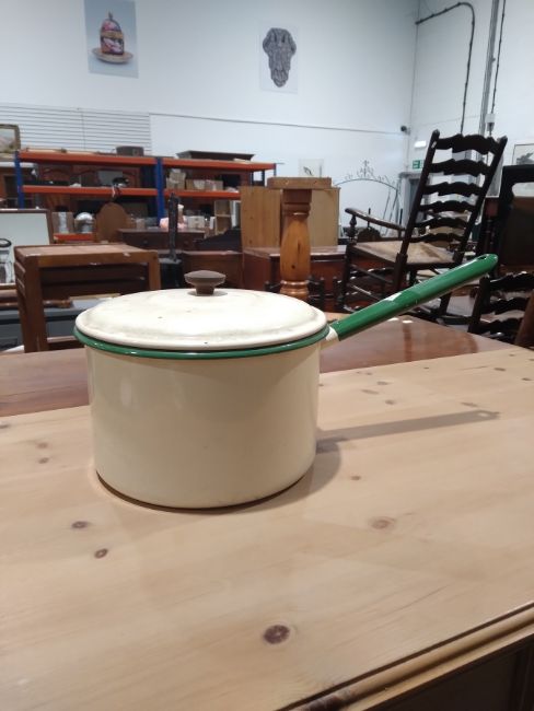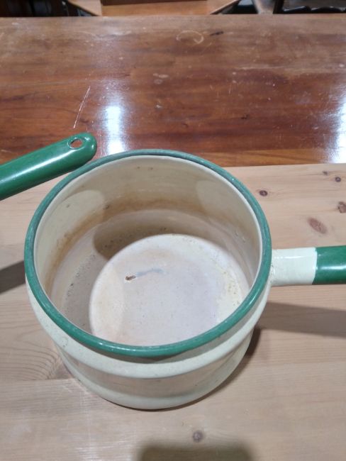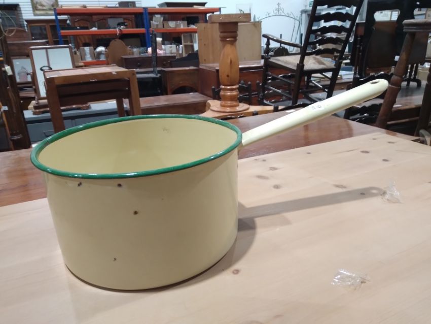 Additional photographs of the enamel saucepans added. The inside bottom of two of the pans are worn and there are some losses and nicks to the enamel in various places.