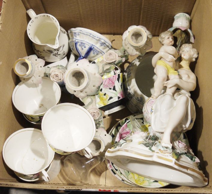 Adderley Lawley part tea service, a Meissen-style candlestick depicting a lady holding a small child, with roses in relief and other items (1 box)