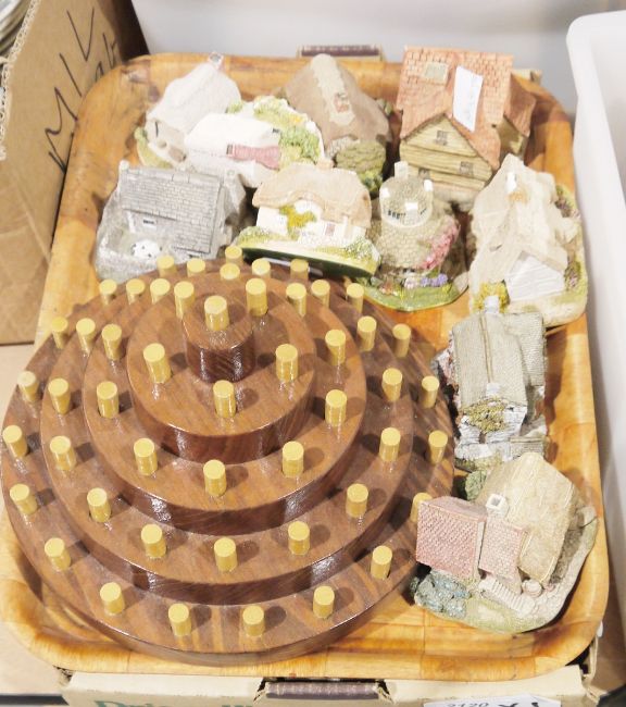Large collection of Lilliput Lane cottages and houses with a wooden thimble display unit