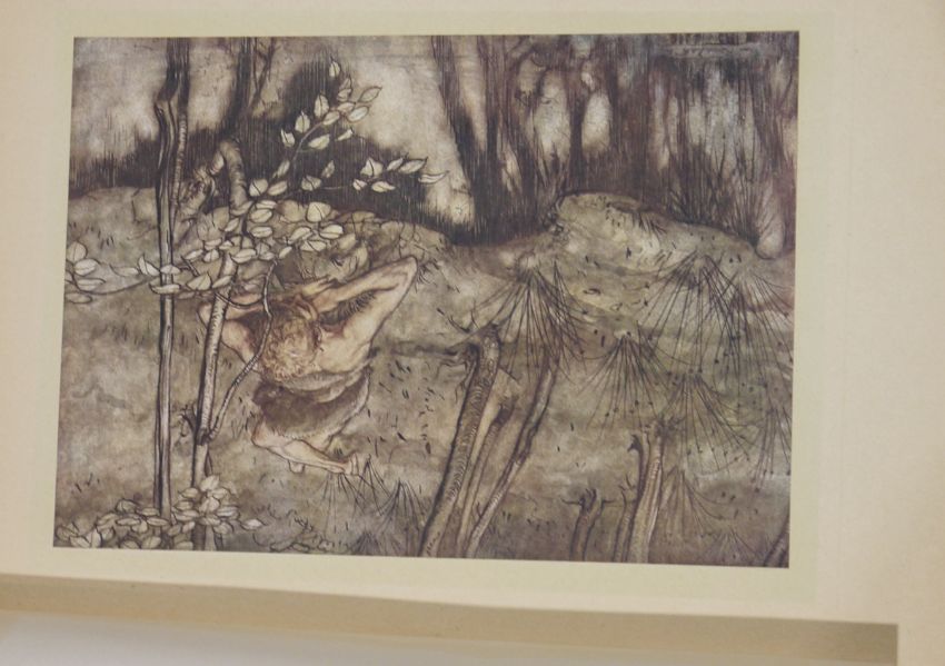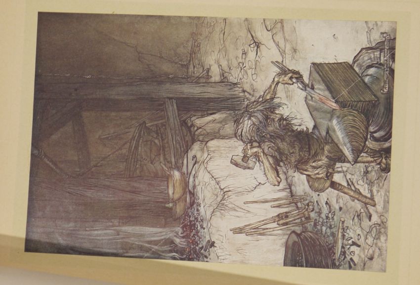 "The Ring of the Nibelung, a Trilogy with a Prelude by Richard Wagner - Siegfried and the Twilight of the Gods", William Heinemann 1911, colour frontis tipped in with lettered tissue guard, vignette on tp, colour plates tipped in all with lettered tissue guards, front hinge cracked and front board separating, grey cloth with gilt titles, part of backstrip separating from the back board