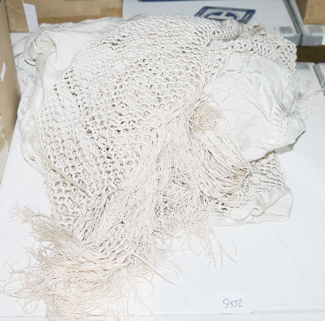 Vintage Chinese-style machine embroidered cream silk shawl with deep fringe,