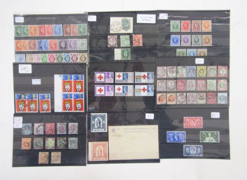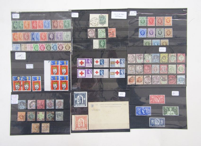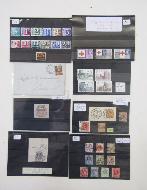 GB stamps: Ex-dealer clear out of 14 stock-cards of mint and used issues, QV-QEII, and 1d Red print-shift cover. Definitives, commemoratives, postage due, charity, fiscal, with postmark interest including overseas use, varieties and print flaws. Higher values to £5.