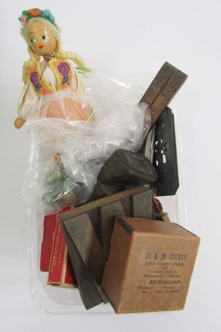 Quantity reproduction Egyptian ceramic amulets, two boxes of playing cards, folding rule, balance scale and other collectables