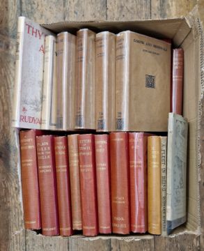 Kipling, Rudyard Works, MacMillan & Co, various dates, red cloth with gilt elephant on front board, four in original dust wrappers "The Years Between", Methuen & Co 1919, faded red cloth with dust wrapper "Thy Servant a Dog", MacMillan & Co, November 1930, red pictorial cloth with dust wrapper, price clipped  "The Phantom Rickshaw and Other Eerie Tales", AH Wheeler & Co, Indian Railway Library No.5, limp covers (1 box)