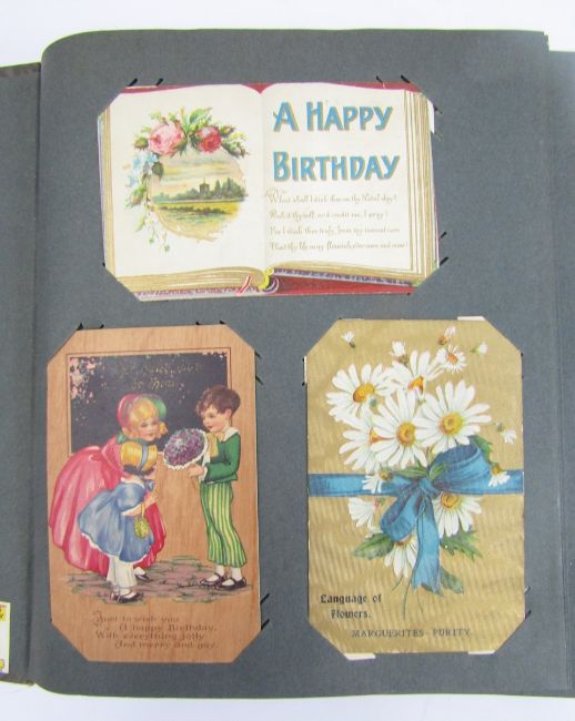 Early 20th century postcard album containing colour, black and white greetings and other cards, 50 pages, approx. 300 in total