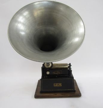 Edison Gem Phonograph, serial no G136930, with key winder and white metal horn