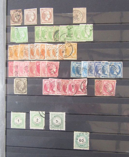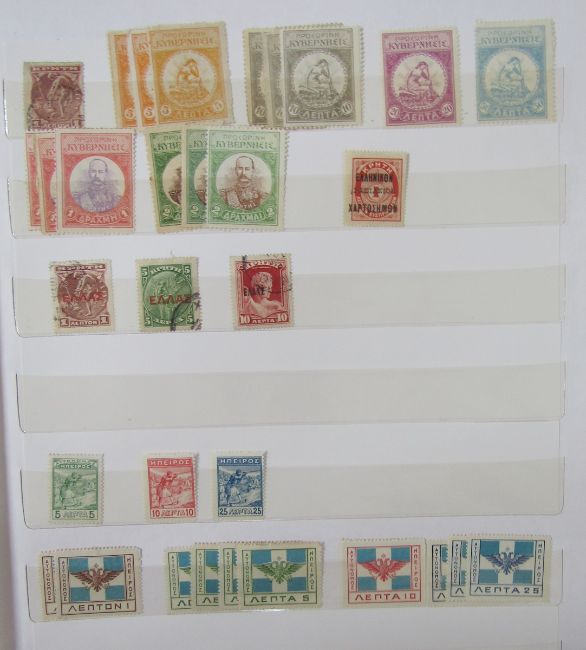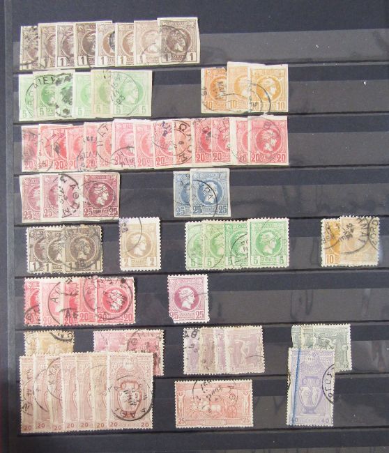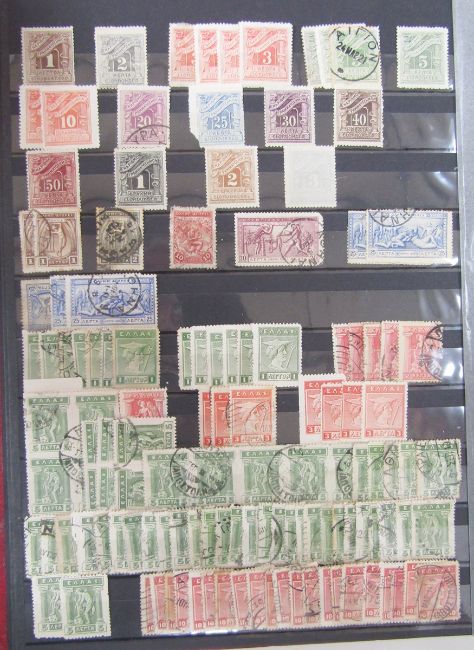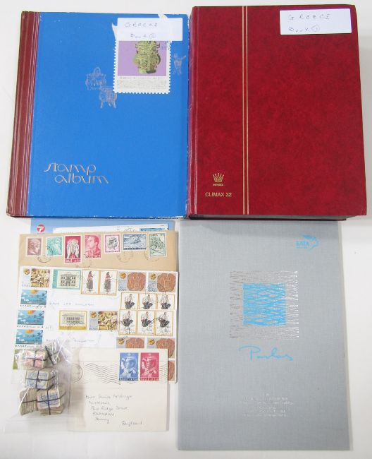 Stamps of Greece: Box of 100s of definitives, commemoratives and other issues in 2 large stock-books, Olympic stamp presentation folder, on cover and in bundle ware, early issues to modern.