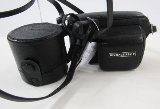 Olympus F Pen FT half frame camera, chrome, serial number 233199, with Olympus F.Zuiko auto s 1:1,8 f=38mm lens, E.Zuiko auto 1:4 f=25mm lens and E.Zuiko auto 1:3,5 f=100mm lens and original instruction manual