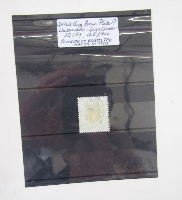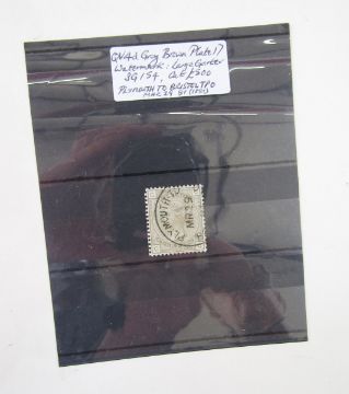 GB stamp: QV 4d grey-brown Plate 17 definitive, SG154, cat £500, with Plymouth TPO postmark of ‘MAR 29 81’.