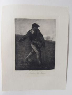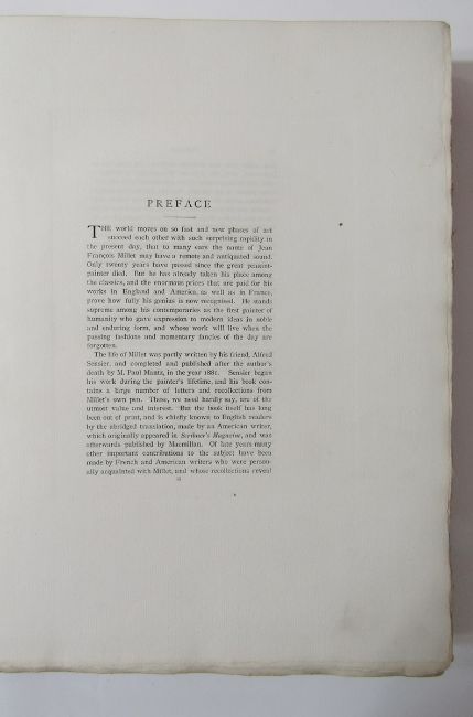 Cartwright, Julia "Jean Francois Millet", Swan Sonnenschein & Co. 1896, large paper edition, no 8 of fifty copies for sale in England, plates tipped in with tissue guards, deckle edges, pastedown inside front board, the black endpapers creased, black cloth with gilt decorated front board, loss to the lower edge of the boards, t.e.g.