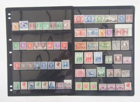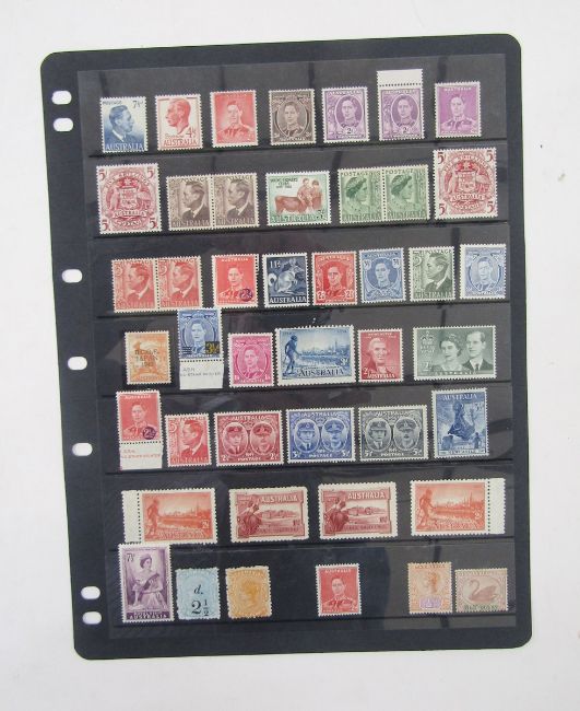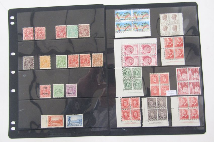 Australian stamps: Five stock-sheets of mint issues, a few QV states, some unmounted. Definitives, commemoratives, postage due and BCOF. Sets and corner blocks with inverted watermark booklet block seen.