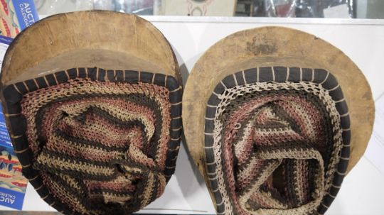 Two large African carved wooden tribal masks, circa 1940s, each with carved features and apertures for eyes and mouth, with striped knitted fitting fixed to reverse, one incised 48 to forehead, 39cm high max. (2) Provenance Acquired in the 1940s in Rhodesia or South Africa.  Condition Report Additional photos added (only)