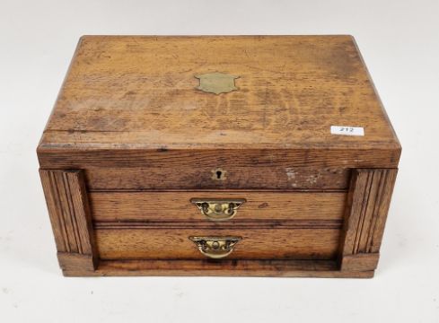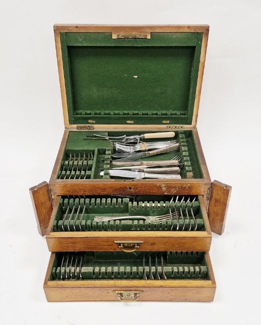 Early 20th century oak canteen comprising two drawer fitted drawers and lidded interior, containing a small selection of silver plated flatware