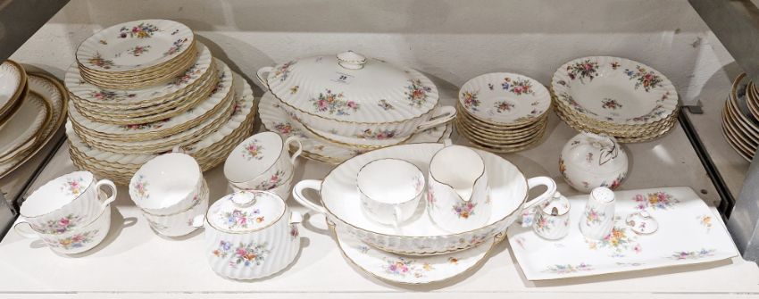 Minton part dinner and tea service, Marlow pattern, viz:- oval two-handled covered tureen, dinner and tea plates in four sizes, dessert bowls, teacups and saucers and sundry pieces