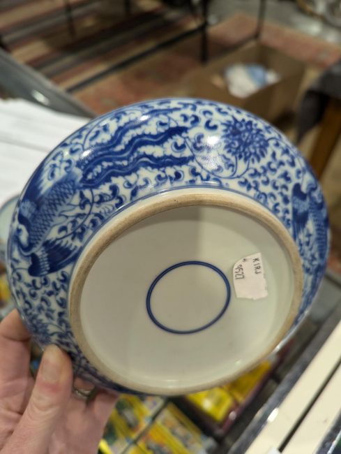 Chinese porcelain teabowl and saucer, underglaze blue decorated with figures in landscape, a Chinese porcelain beaker with slightly everted rim and blue floral decoration, 8cm high, a Chinese porcelain saucer dish with two phoenix in underglaze blue, 18cm diameter and a Chinese porcelain octagonal dish painted with horse in underglaze blue, 15cm diameter  Condition Report Beaker - faint hairline crack to rim and small rim chip. Minor glaze scratching to interior: 8cm high. Teacup and saucer - hairline crack to rim of saucer and starcrack to base of saucer. Minor footrim chipping. Teacup with small chip beneath glaze and firing crack. Octagonal dish - in good order, minor sanding to glaze, 14.7 cm wide.Saucer dish with phoenix - wear to glaze, 18cm. diam.