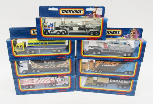 Seven boxed Matchbox Convoy diecast models to include CY 16 Scania Box Truck, CY 24 DAF Box Car, CY 36 Kenworth Box Car, CY 25 DAF Box Truck, CY 22 DAF Powerlaunch Transporter, CY 2 Kenworth Rocket Transporter and CY 23 Scania Covered Truck (7)
