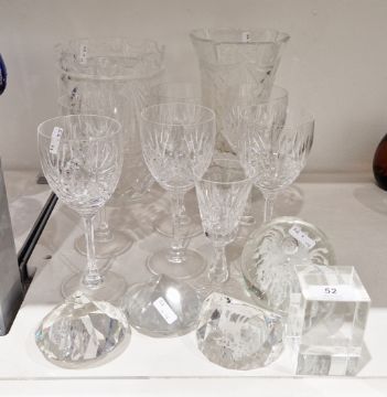 Six contemporary cut-glass wine-glasses, another smaller, two cut-glass vases, two faceted paperweights, an etched Canadian paperweight, a dump-shaped weight and another laser block with cats (14)