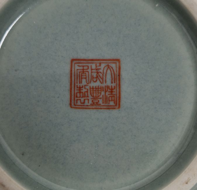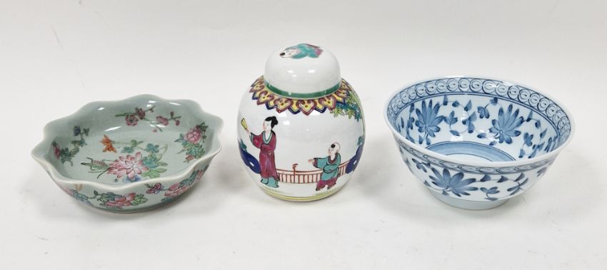Chinese porcelain dish with wavy border and grasshopper and floral decoration on a celadon ground, 16cm diameter, a ginger jar and cover, and a small blue porcelain bowl (3)