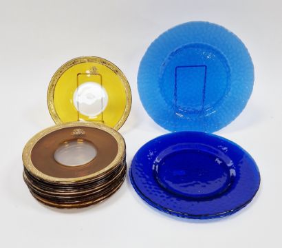 Set of 13 Continental glass amber-flashed and gilt monogrammed stands, each with entwined gilt monogram and gilt foliate border, together with three moulded and part-frosted pebble pattern glass dishes, 27.5cm diam. (16)