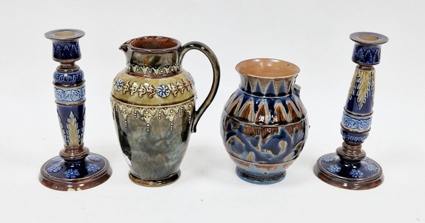 Royal Doulton glazed stoneware jug, green ground with formal flowerhead and leaf decoration, 20cm high, Doulton Lambeth stoneware jug (damaged) and two Doulton stoneware table candlesticks (4)