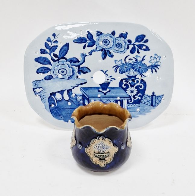 Masons Ironstone china drainer, rounded oblong with underglaze blue chinoiserie vase and foliate decoration, 31cm wide and a Royal Doulton stoneware small vase with frilled rim, blue ground, floral vase decoration, 10cm high (2)