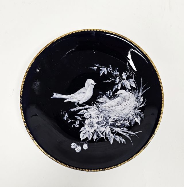 Royal Worcester dark blue ground cabinet plate, circa 1870, impressed marks, decorated in white with a nest of birds amongst fruiting blackberries and grasses, within gilt dentil rim, 23cm diameter