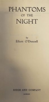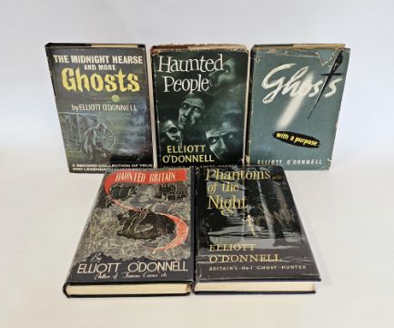 O'Donnell, Elliott "Ghosts with a Purpose", Rider and Company July 1952, turquoise cloth, some light staining to front boards, dustwrapper, chipped and with some loss at the top, price clipped, "Haunted People", Rider and Company 1955, brown cloth, dustwrapper, some chips, not price clipped, "The Midnight Hearse and More Ghosts",  W. Foulsham & Co. 1965, blue cloth, dustwrapper, not price clipped,  "Phantoms of the Night", Rider and Company 1956, dark blue cloth, red ink name inside front board,  "Haunted Britain", Rider and Company, black cloth, corners bruised, dustwrapper, not price clipped (5)