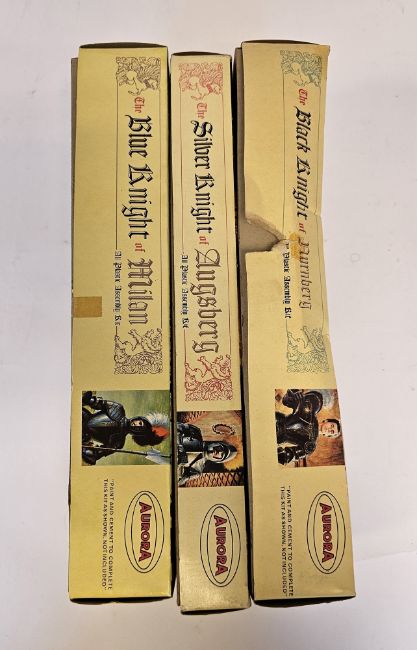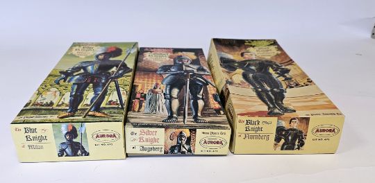 Three boxed Aurora Knight Series plastic assembly kits to include 471 The Silver Knight of Augsburg, 472 The Blue Knight of Milan and 473 The Black Knight of Nurnberg (3)
