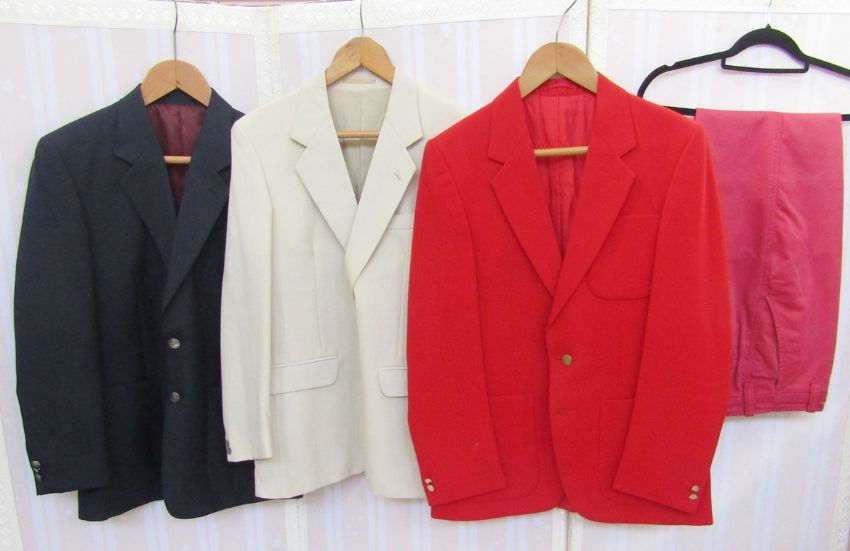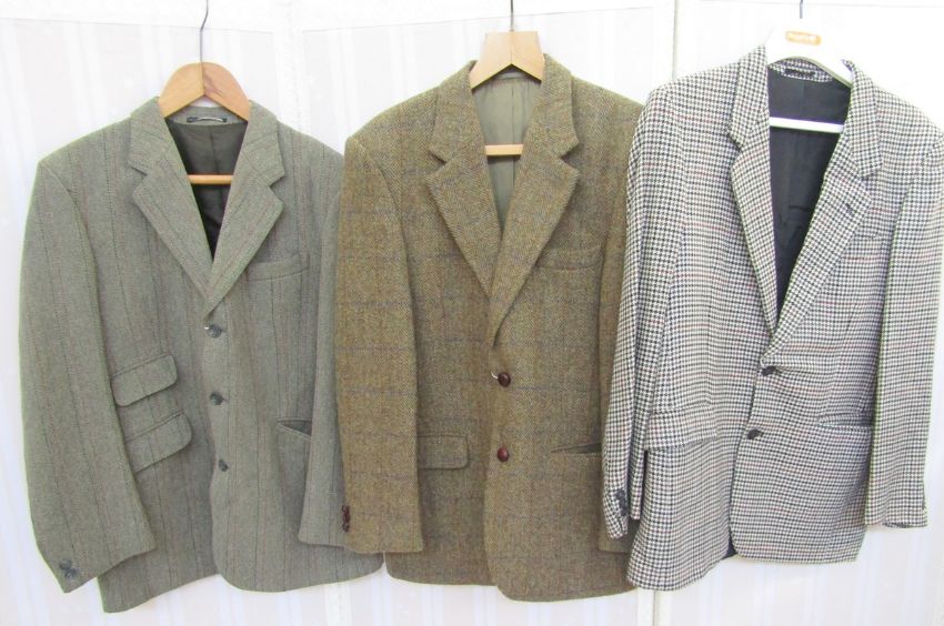 Selection of gentleman's vintage jackets to include tweed hacking jacket labelled Brooks Taverner, a Harris tweed jacket, various, a blue blazer, a red jacket, a pale summer suit and others (8) Condition Report The sizes of the jackets are as follows:Harris Tweed - 38RBrooks Taverner - 40RHerringbone BHS (pure new wool) - 38John G Hardy (red jacket) - size approx 38Black Moorcroft - 38RCream Skads - 40RDombey & Son - approx 38-40