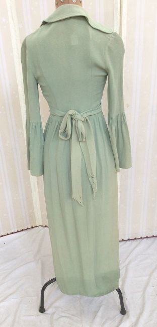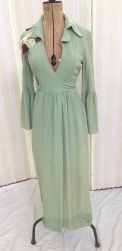 Ossie Clarke for Radley - moss crepe wrap dress, maxi, sage green, the colour is faded where the dress has been folded, the hem has had moth damage and the tie belt and other edges are frayed, size 12 (attached a photo of the vendor dancing in the dress)