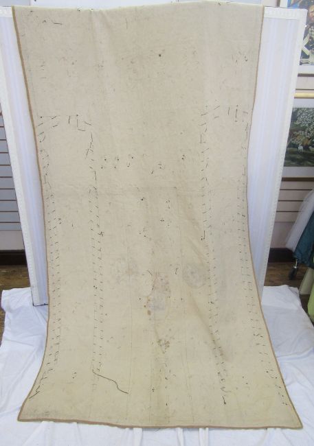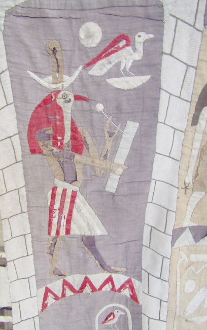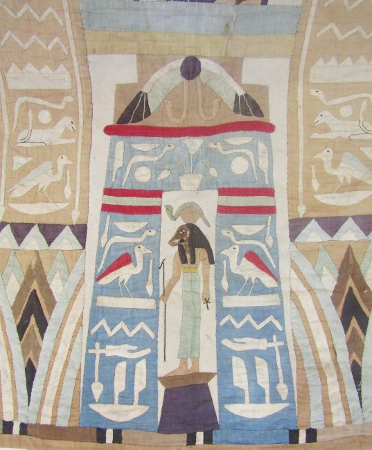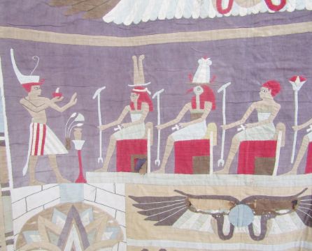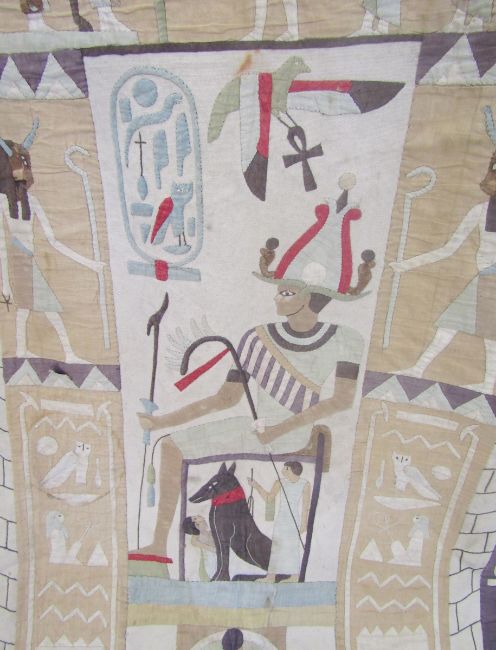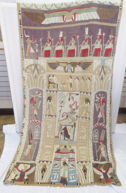 1920's vintage quilted and appliqued cotton wall hanging - featuring Egyptian figures, animals and hieroglyphics, lined and with rings for hanging, there is some wear and loss, 137.5cm wide x 283cm long approx.
