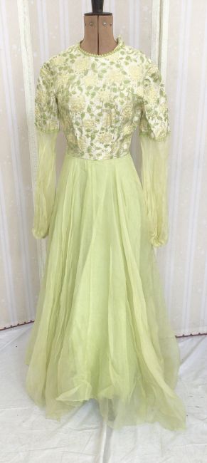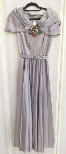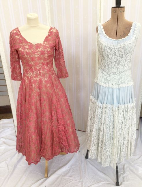 Various 1950's and 1940's evening dresses to include a blue, figured satin dress, with stiff underskirt, the bodice with fold over pleats and broad straps, a teal blue dress with dropped waist and ruched detail to the bust line, a pink lce dress, over a cream strapless underdress, full length sleeves and sweetheart neckline, three quarter length sleeves, a pale blue chiffon and cream lace sleeveless dress, with tiered skirt, a 1930's mustard crepe evening dress, with sequins embroidered on the bodice (some missing), dress with brocade bodice over a yellow chiffon skirt, a salmon pink evening dress with black net ruffles to the hem and front of the dress and a grey satin evening dress with draped shawl collar and faux flower posy, labelled Illum Kobenhaven (8)