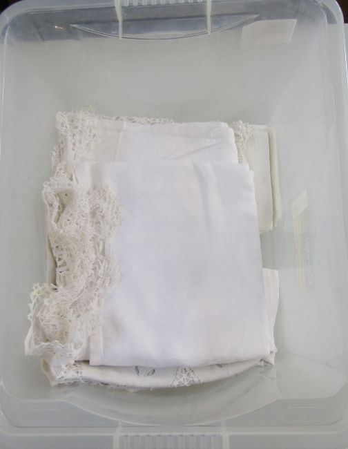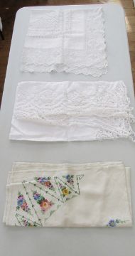 Embroidered and drawn thread work table cloth, damask napkins and embroidered linens (1 box)