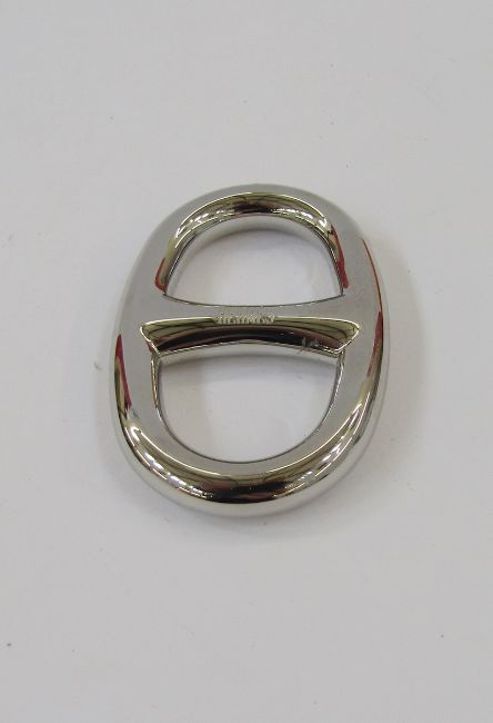 Hermes scarf/belt buckle, silver coloured metal, with original brown velvet, drawstring bag and Hermes box
