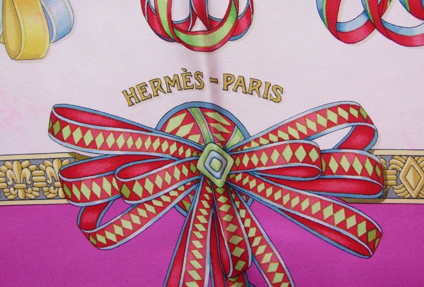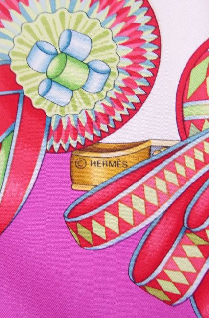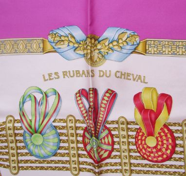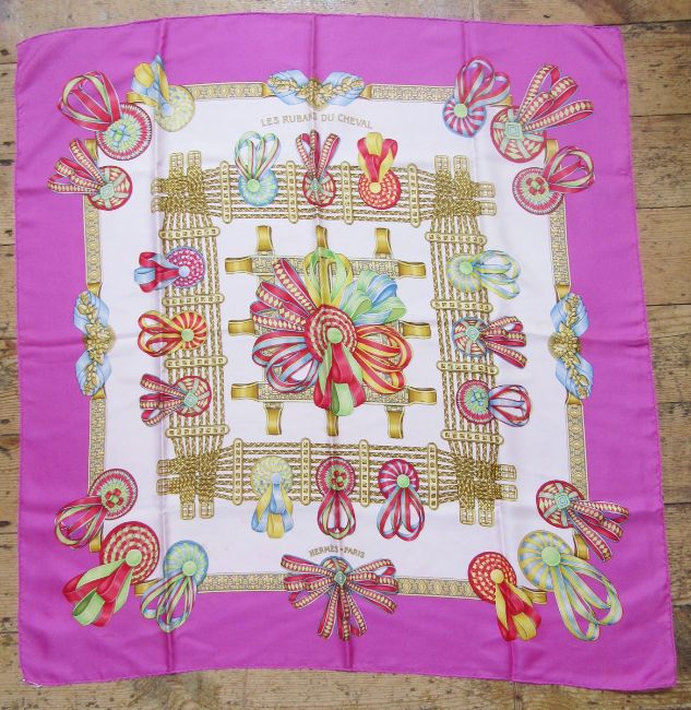 Hermes silk scarf - 'Les Rubans de Cheval' designed by Joachim Metz 1993, bright pink border, multicoloured rosettes in a cream ground (no box), some slight pink stains lower left hand corner