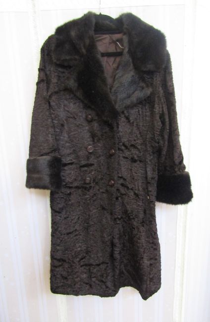 A vintage black faux astrakhan coat with black mink collar and deep cuffs, double breasted and waisted, with a vintage black faux fur coat (2)
