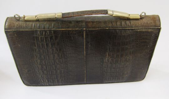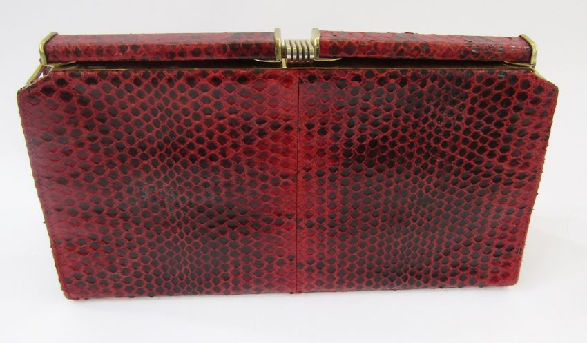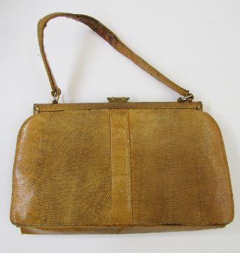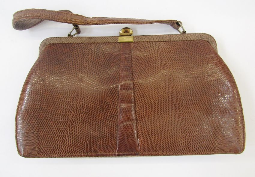 Two vintage Mappin and Webb lizard skin handbags, fixed frame, gilt metal hardware, single strap handles, one brown, the other yellow/fawn, a vintage Fassbender red snakeskin bag, with matching purse, gilt metal hardware, fixed frame, shoulder strap missing, and a vintage alligator bag (4)