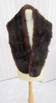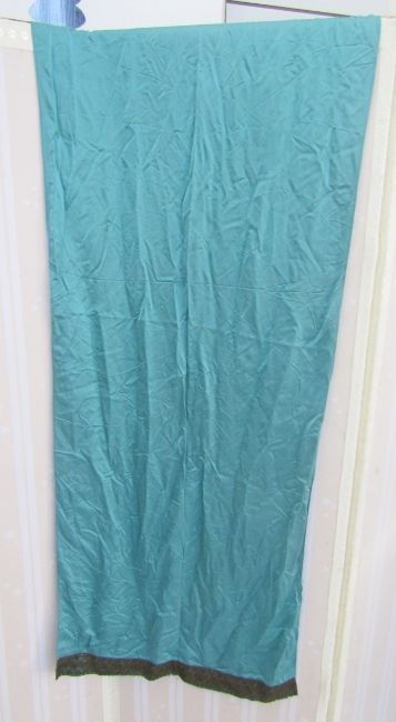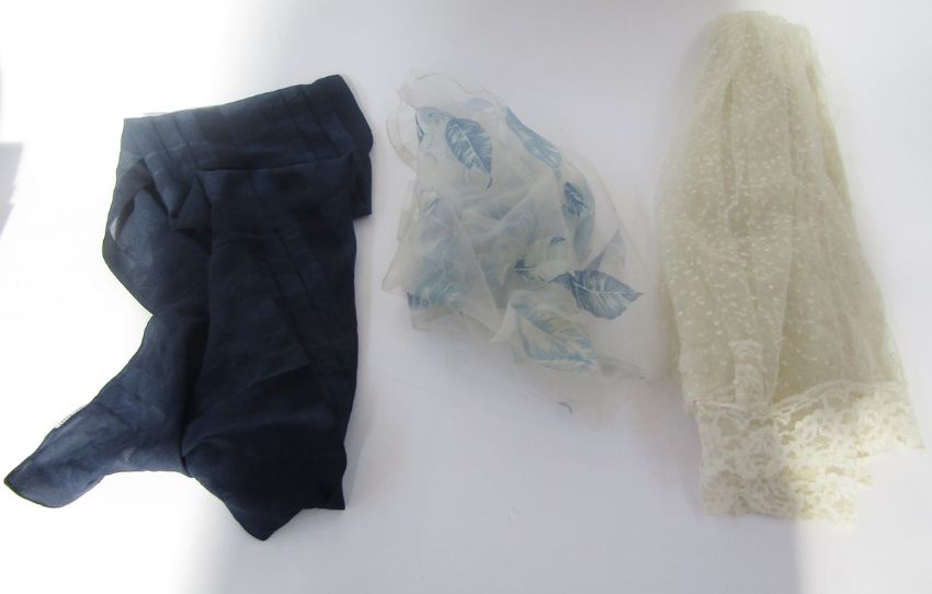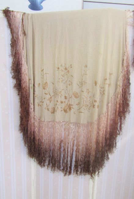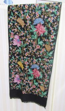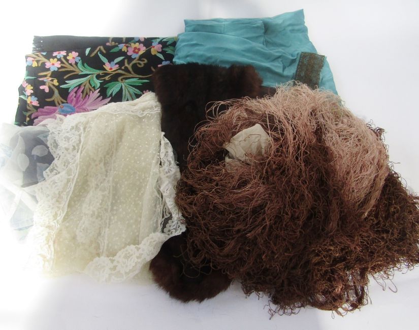 A black wool shawl with crewel work floral decorations in vivid colours, a turquoise silk shawl with metal braid border, an Edwardian cream silk shawl, embroidered flowers in one corner, a deep fringe in shades of brown and cream, a vintage fur stole and two other small scarves (1 box)