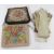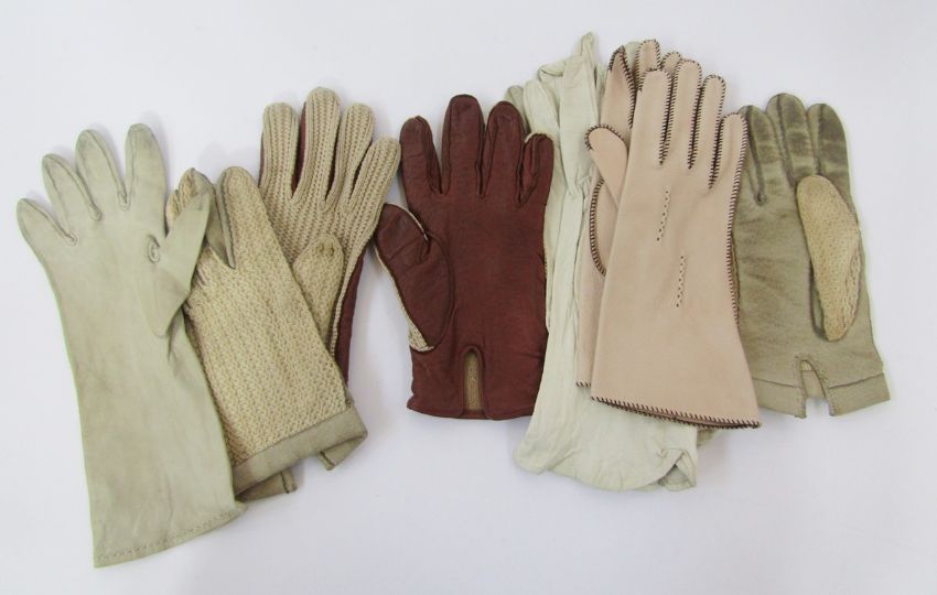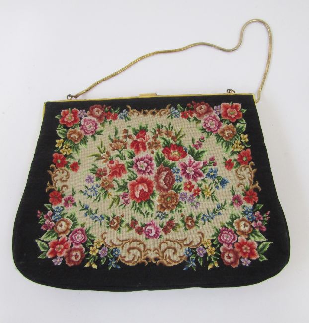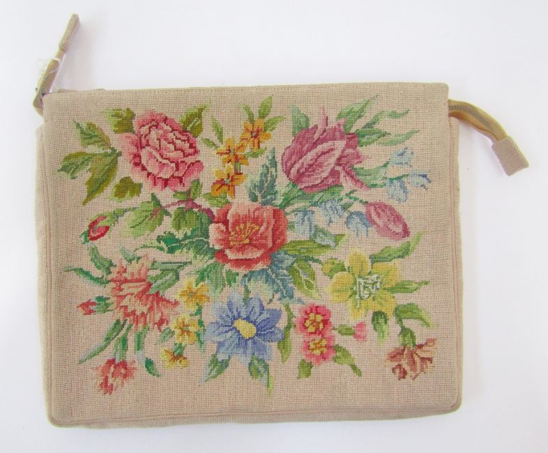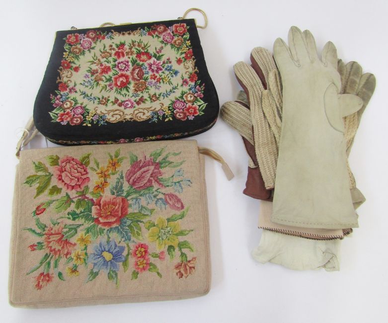 Vintage petitpoint evening bag, depicting roses, fixed frame, gilt metal hardware, a faux agate clasp and gold coloured chain handle, a cream petit pointe clutch bag, mixed flowers, zip fastening, a pair of cream kid gloves with black blanket stitch detail, two other pairs of kid gloves and two pairs of vintage driving gloves, string and leather