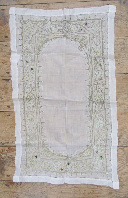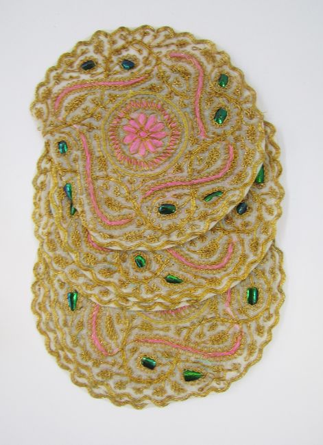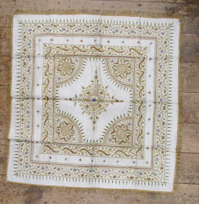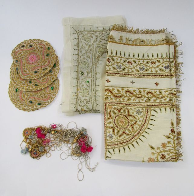 An Indian heavily embroidered cover in gold and silver thread with coloured silk details, gilt metal fringe, 77 x 73cm approx, and various other gilt metal embroidered pieces and fringing