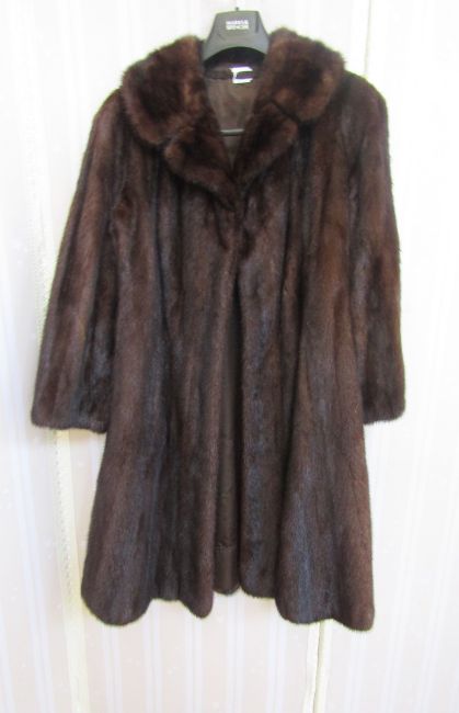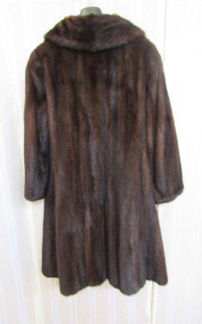 Dark ranch mink full length coat, satin embroidered lining with inset tie waist belt