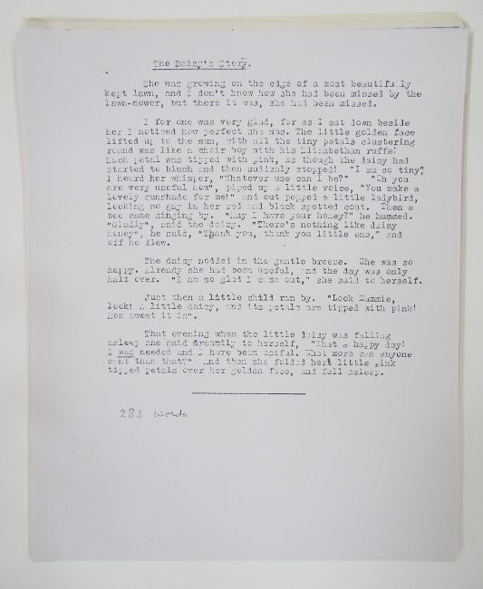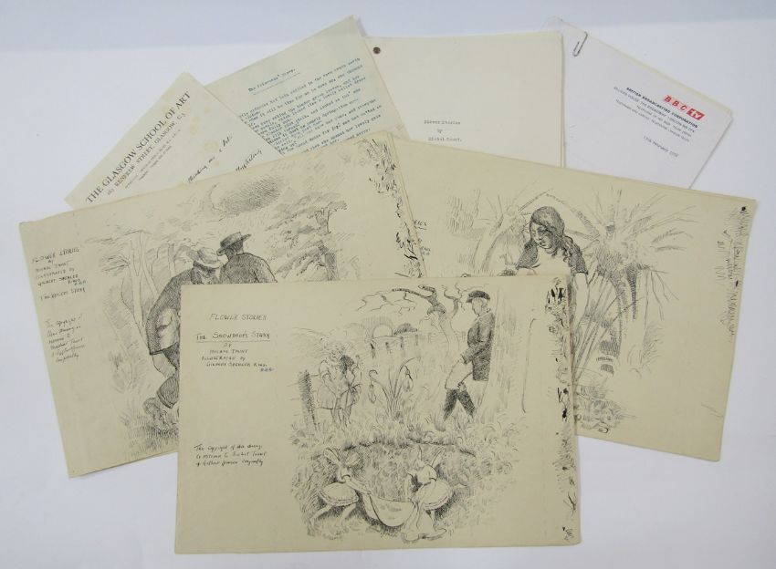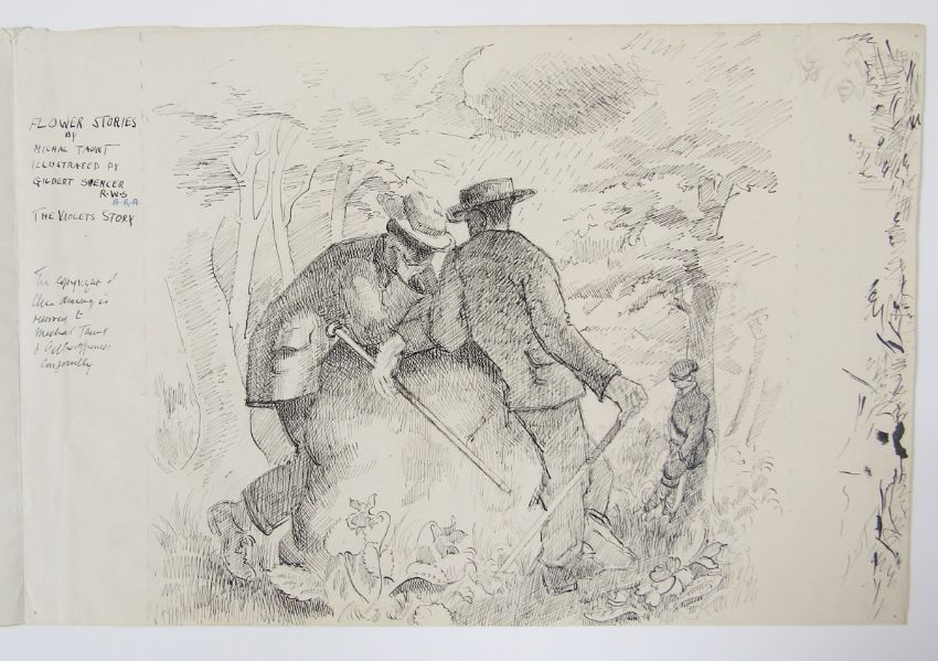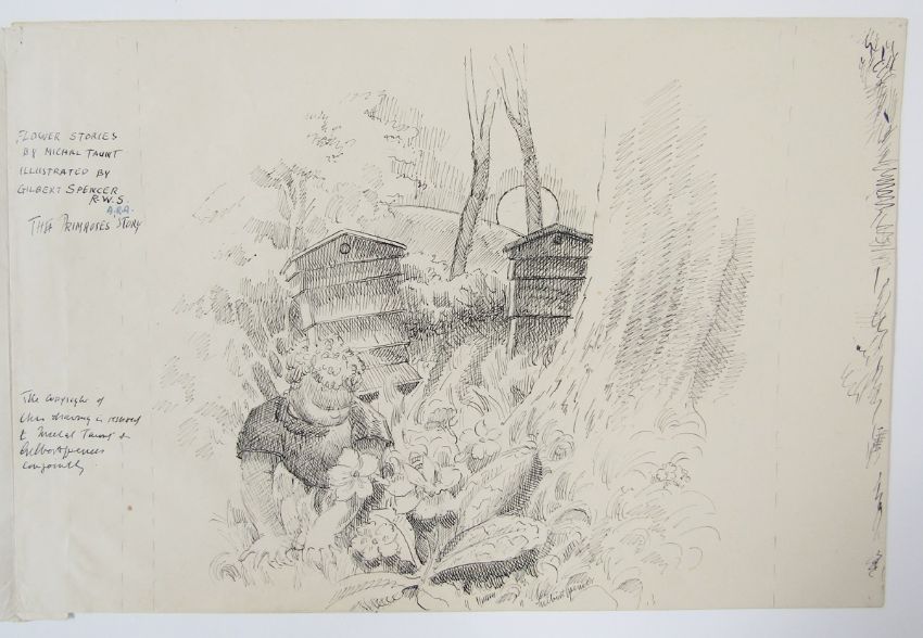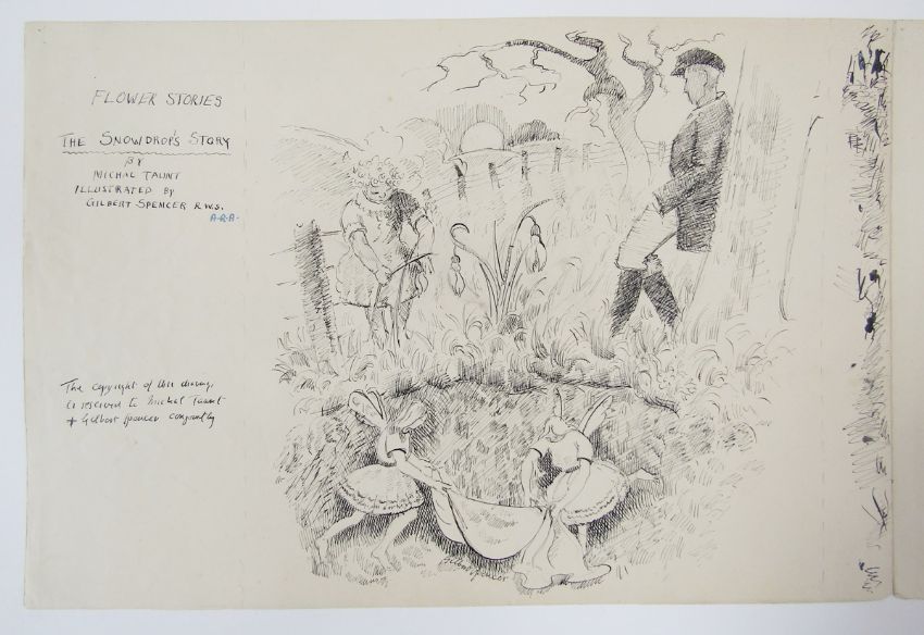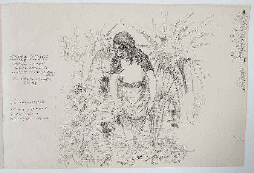 Gilbert Spencer RA (1892-1979) Archive of illustrations (illustrations c1950), stories and correspondence, dating from the 1950's-1970's, the letters being sent between Gilbert Spencer and aspiring writer Marjorie Freeman, unpublished stories entitled 'Flower Stories'. Gilbert Spencer's illustrations for the stories were kept by Marjorie Freeman's family and have never previously been published. Gilbert was the younger brother of Sir Stanley Spencer, one of the best-known English artists of the early 20th century, and an influence on the work of later luminaries such as Lucien Freud.The illustrations – for a series of unpublished children’s stories – were the result of a lifelong friendship between Gilbert and Marjorie Freeman.In the late 1940s and early 1950s, Marjorie wrote a series of tales for children entitled ‘Flower Stories’, each recounting the story of an individual flower, such as ‘The Primrose’s Story’ and ‘The Daisy’s Story’.Marjorie – who wrote under the pseudonym Michal Taunt – retired to Gloucestershire, and in the 1970s she entered the stories into a BBC competition.Gilbert studied at the Royal College of Art and the Slade School of Fine Art, and later became a member of the Royal Academy.Examples of his work are owned by the Tate Gallery and the RA.