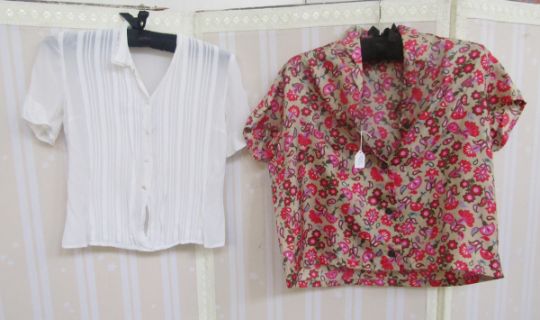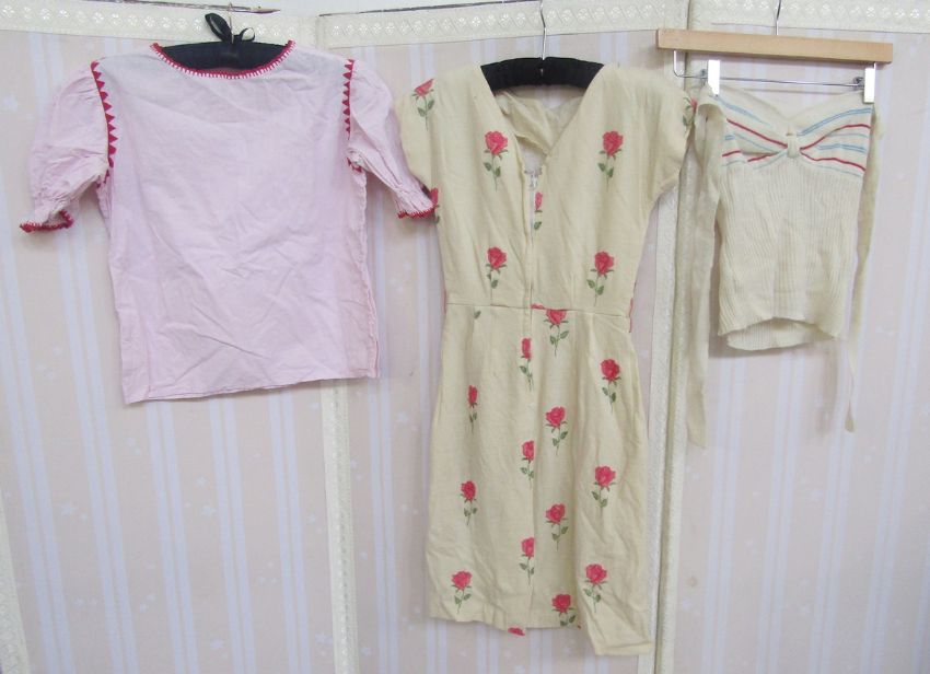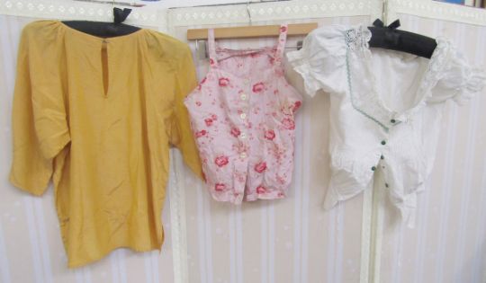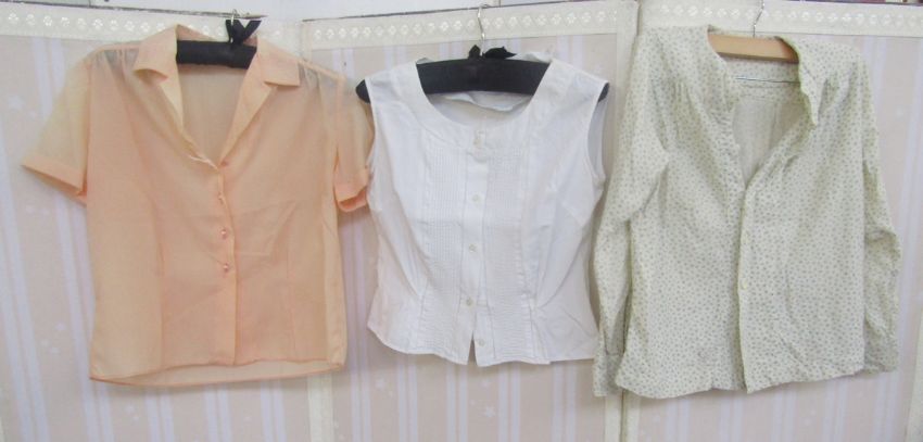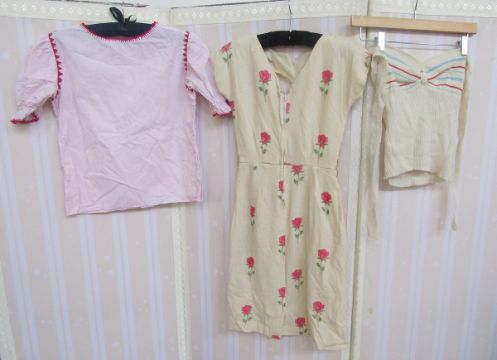 Various vintage blouses to include white crepe, pintucked blouse with tiny ricrac detailing to Peter-Pan collar, yellow silk peasant style blouse, labelled Mary Pothercary, a cotton cami style rose printed top, a white cotton blouse with pin tucks, lace and green ricrac detailing, an apricot coloured crimplene blouse, a 1950's knitted halter neck top, a 1950's wool shift dress embroidered with roses (with moth damage) and other items (1 box)
