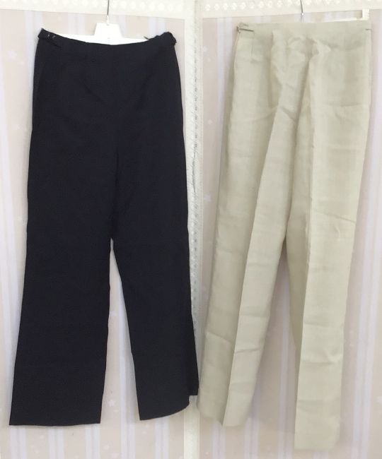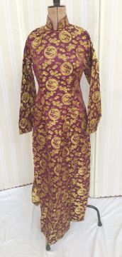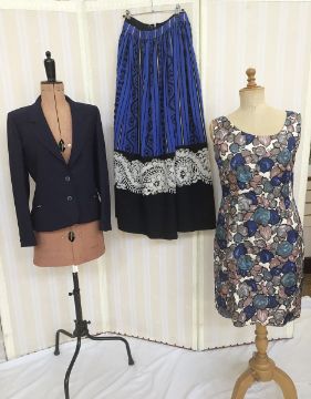 Blue fitted jacket, labelled Mansfield/Harrods, a full length blue dirndl style skirt, blue and black wool, with black braid detail and a deep cream embroidered border, a silk shift dress, a modern full length cheongsam, maroon with gold thread embroidery, two blue moire silk evening skirts, a Patrice Merel full length wool skirt in Liberty style print, and two pairs of Daks for Simpson lady's slacks, cream and blue (9)